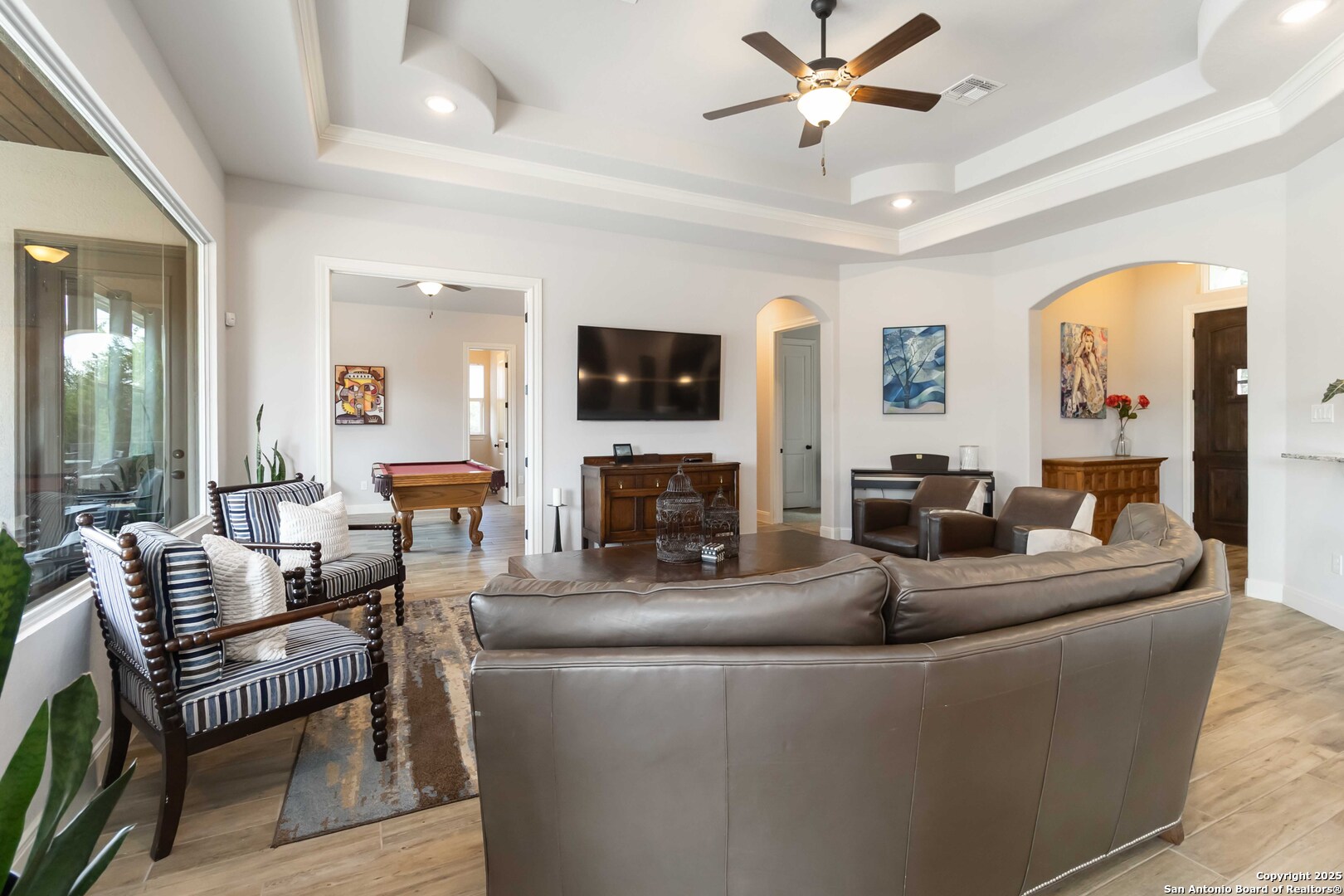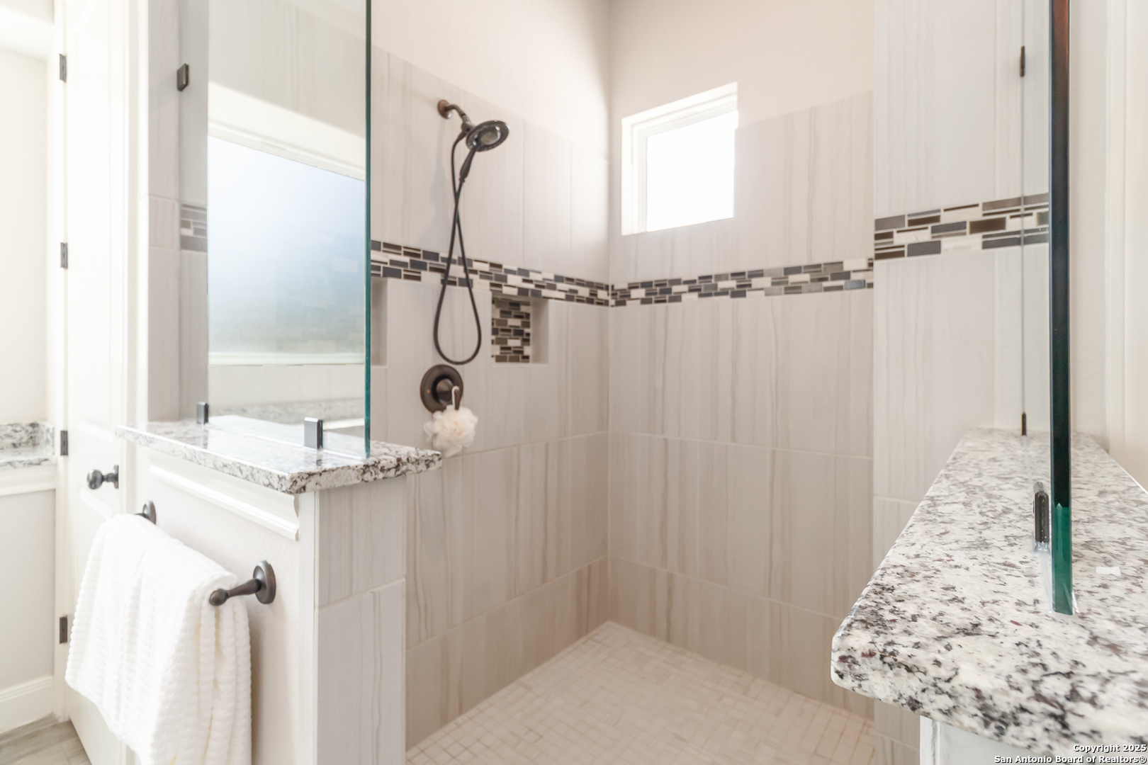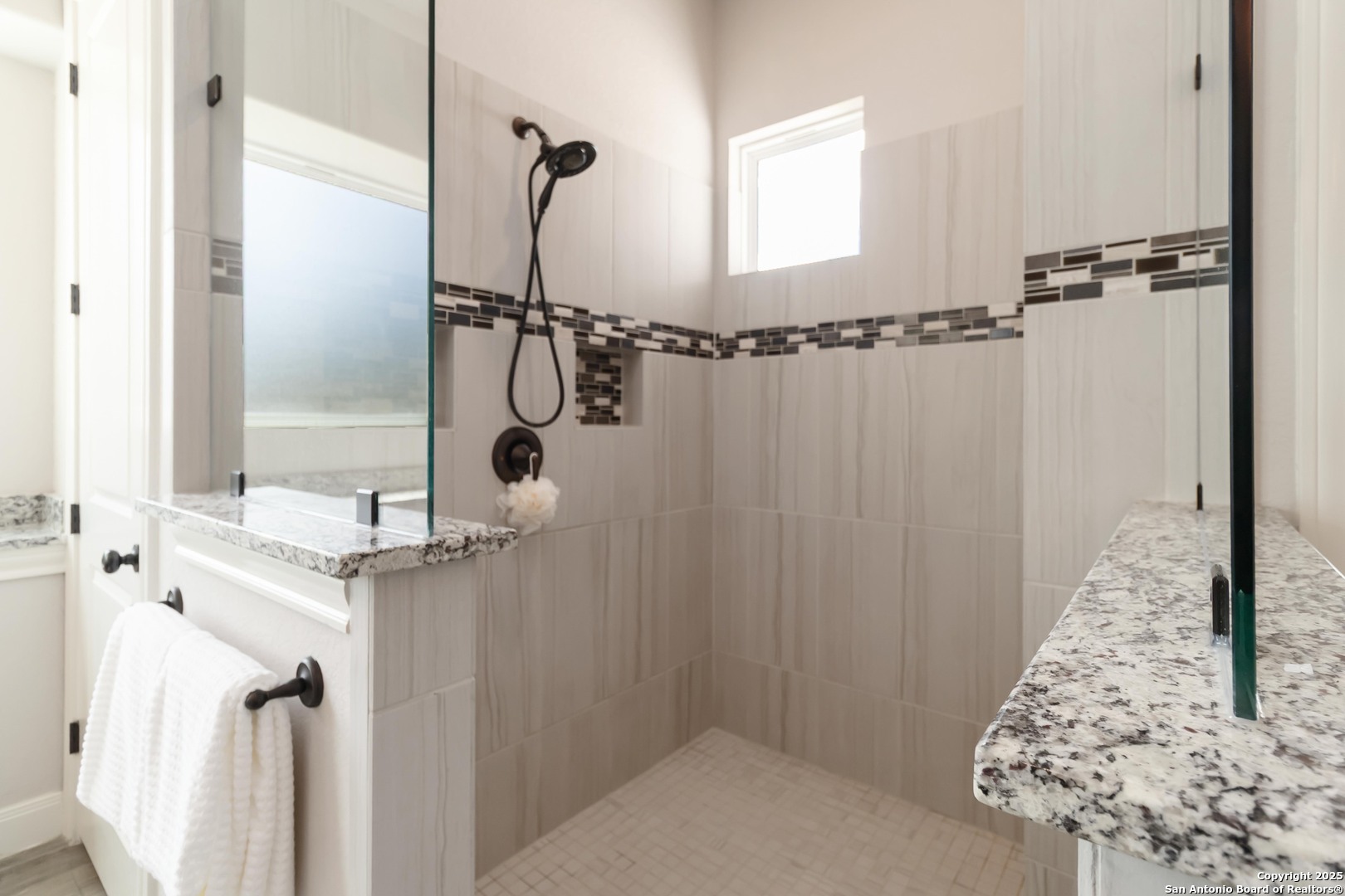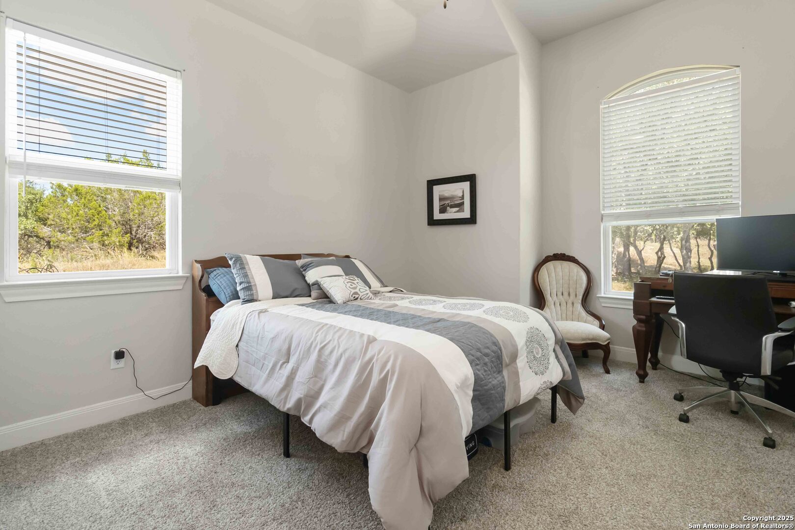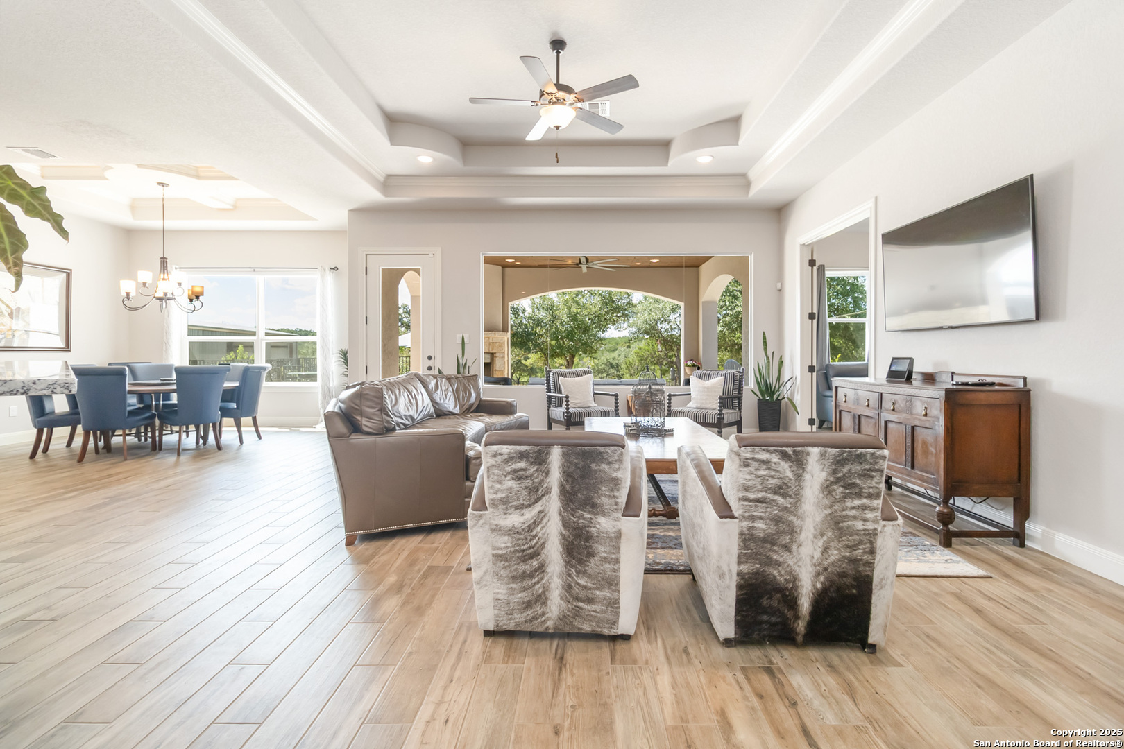 Step into hill country elegance with this striking one story residence, nestled on a sprawling 3.36 acre lot in the exclusive Mystic Shores community. Boasting 3 bedrooms, 2.5 baths, and 2,544 sq ft of thoughtfully designed living space. This home delivers both comfort and sophistication. The open-concept layout flows effortlessly from the foyer through the main living area and into the chef's kitchen, complete with a generous center island, breakfast bar, granite surfaces, and custom cabinetry. Tray and stepped ceilings accent many rooms, while strategically placed wall niches offer subtle architectural interest. Retreat to the primary suite, offering a sitting alcove, double vanities, a garden tub, separate shower, and a large Bespoke walk-in closet. Two additional bedrooms are supported by a full bathroom and a powder room, ideal for guests or flexible use. A dedicated game or media room adds extra living potential with it's own powder room, closet and outdoor access leading the the pool! Step outside into your private outdoor haven. A sparkling in-ground pool with an elegant water feature that adds a touch of resort-style luxury. An oversized covered patio anchored by a built-in fireplace invites year-round enjoyment, whether it's quiet mornings or entertaining under the stars. Nestled in the backyard, the gazebo offers a serene, shaded retreat ideal for morning coffee, evening gatherings, or quiet afternoons surrounded by nature. Just steps away, the greenhouse provides a year-round haven for gardening enthusiasts-whether you're growing fresh herbs, vibrant flowers, or seasonal vegetables, this space is both functional and inspiring. The versatile 30' x 60' metal RV building offers exceptional functionality and space, ideal for storing RVs, boats, vehicles, equipment, or even converting into a workshop or hobby space. Built to last with durable steel construction, this structure features high-clearance entry, wide roll-up doors, and ample interior room for oversized vehicles and storage needs. Whether you're a full-time RV enthusiast, collector, or business owner, this building provides the security, space, and flexibility to accommodate a wide range of uses. Beyond your front door, Mystic Shores rewards residents with expansive amenities: parks, trails, community pool access, lakefront recreation, and more - all within a community that blends natural beauty, privacy, and convenience. Don't miss the chance to own a move-in ready, architecturally rich home in one of Spring Branch's most desirable enclaves.