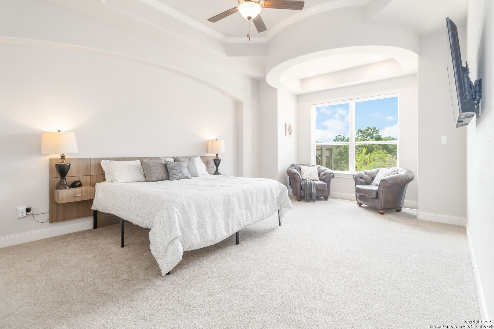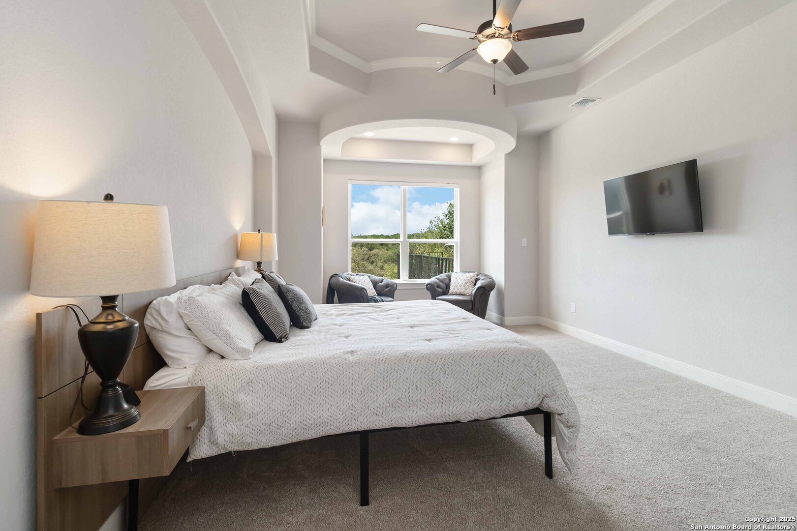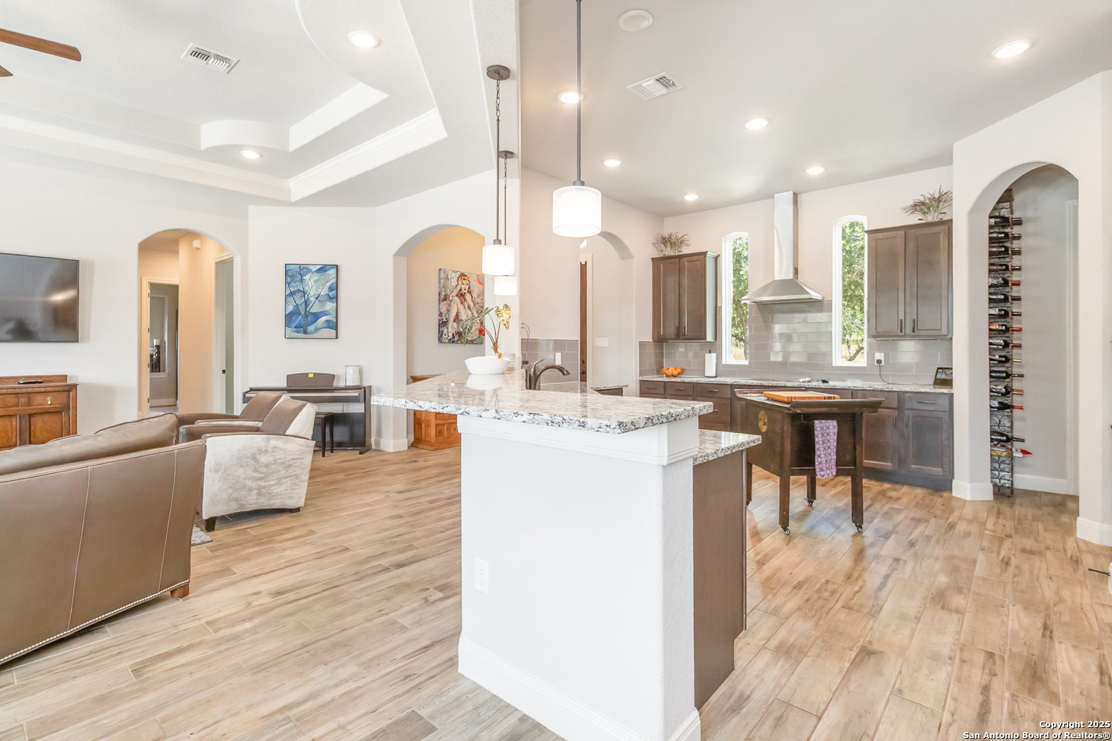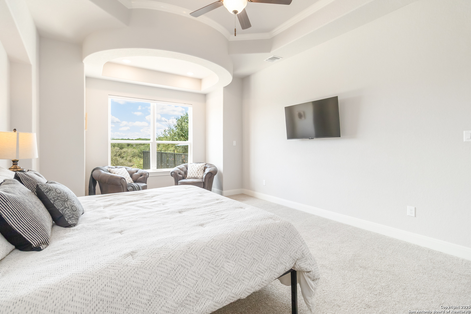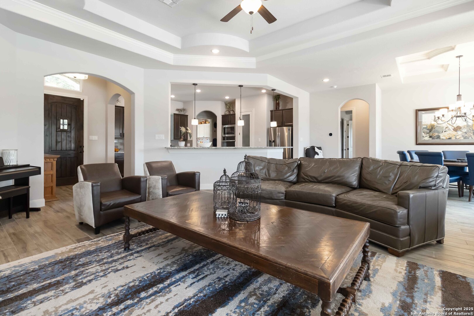 Step into hill country elegance with this striking one story residence, nestled on a sprawling 3.36 acre lot in the exclusive Mystic Shores community. Boasting 3 bedrooms, 2.5 baths, and 2,544 sq ft of thoughtfully designed living space. This home delivers both comfort and sophistication. The open-concept layout flows effortlessly from the foyer through the main living area and into the chef's kitchen, complete with a generous center island, breakfast bar, granite surfaces, and custom cabinetry. Tray and stepped ceilings accent many rooms, while strategically placed wall niches offer subtle architectural interest. Retreat to the primary suite, offering a sitting alcove, double vanities, a garden tub, separate shower, and a large Bespoke walk-in closet. Two additional bedrooms are supported by a full bathroom and a powder room, ideal for guests or flexible use. A dedicated game or media room adds extra living potential with it's own powder room, closet and outdoor access leading the the pool! Step outside into your private outdoor haven. A sparkling in-ground pool with an elegant water feature that adds a touch of resort-style luxury. An oversized covered patio anchored by a built-in fireplace invites year-round enjoyment, whether it's quiet mornings or entertaining under the stars. Nestled in the backyard, the gazebo offers a serene, shaded retreat ideal for morning coffee, evening gatherings, or quiet afternoons surrounded by nature. Just steps away, the greenhouse provides a year-round haven for gardening enthusiasts-whether you're growing fresh herbs, vibrant flowers, or seasonal vegetables, this space is both functional and inspiring. The versatile 30' x 60' metal RV building offers exceptional functionality and space, ideal for storing RVs, boats, vehicles, equipment, or even converting into a workshop or hobby space. Built to last with durable steel construction, this structure features high-clearance entry, wide roll-up doors, and ample interior room for oversized vehicles and storage needs. Whether you're a full-time RV enthusiast, collector, or business owner, this building provides the security, space, and flexibility to accommodate a wide range of uses. Beyond your front door, Mystic Shores rewards residents with expansive amenities: parks, trails, community pool access, lakefront recreation, and more - all within a community that blends natural beauty, privacy, and convenience. Don't miss the chance to own a move-in ready, architecturally rich home in one of Spring Branch's most desirable enclaves.