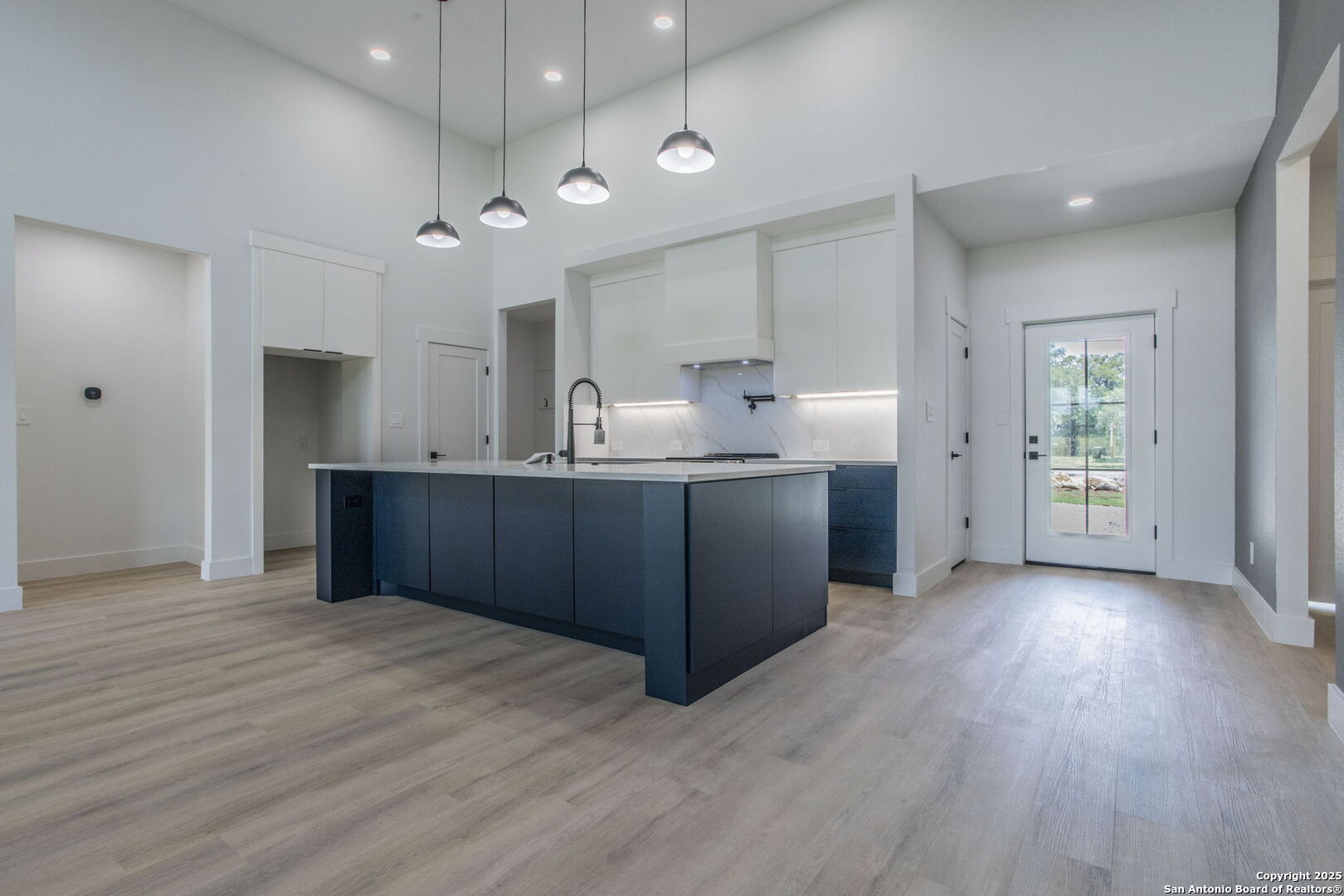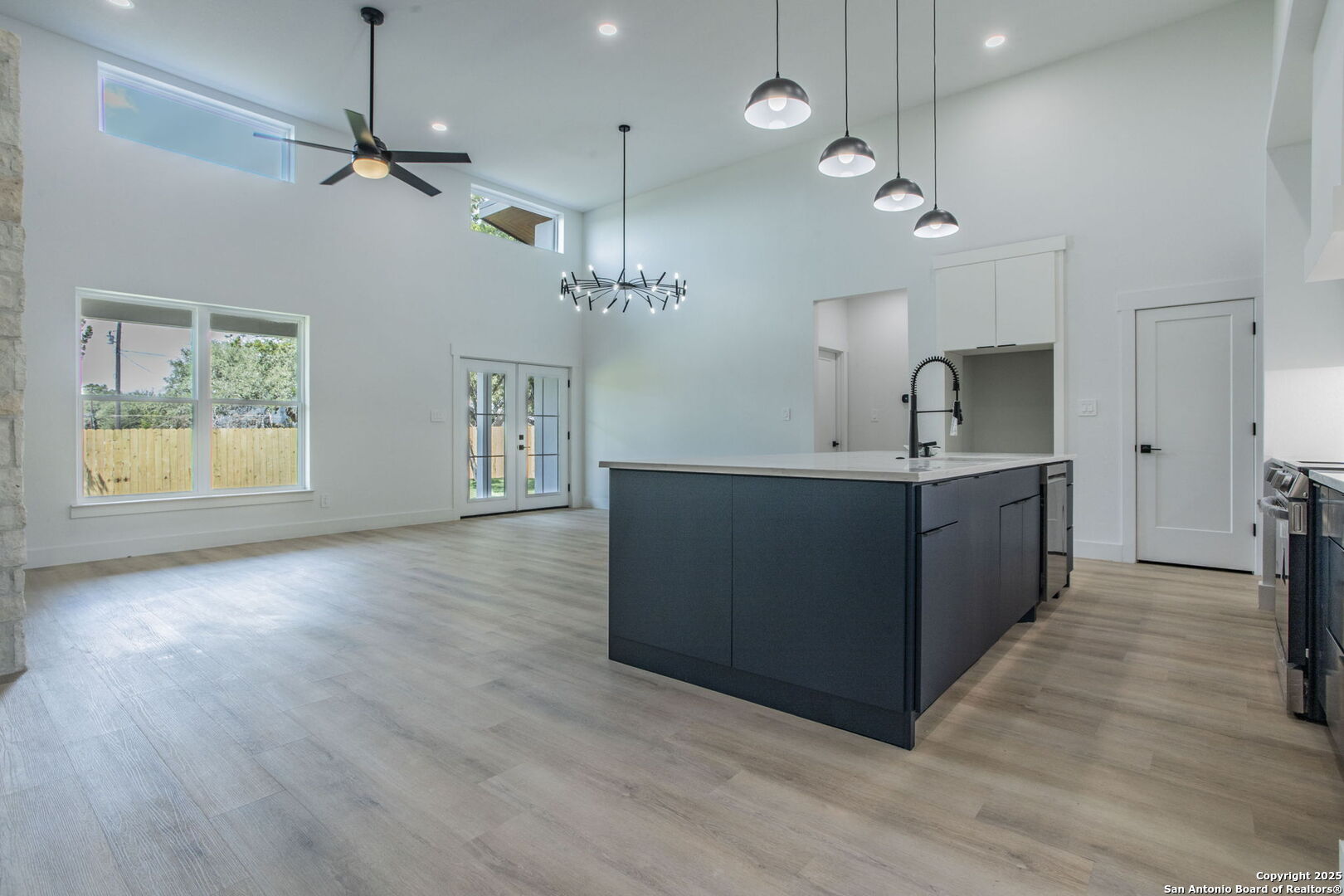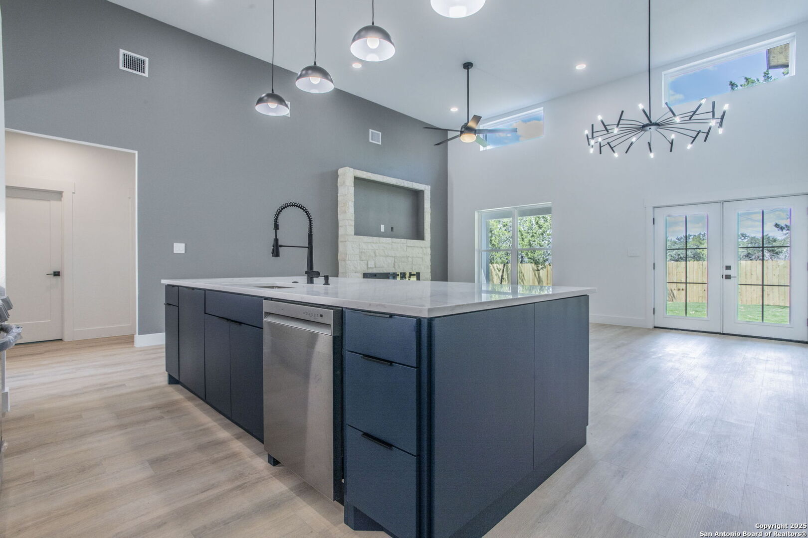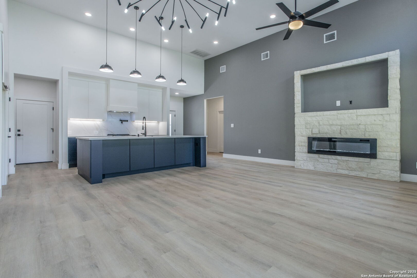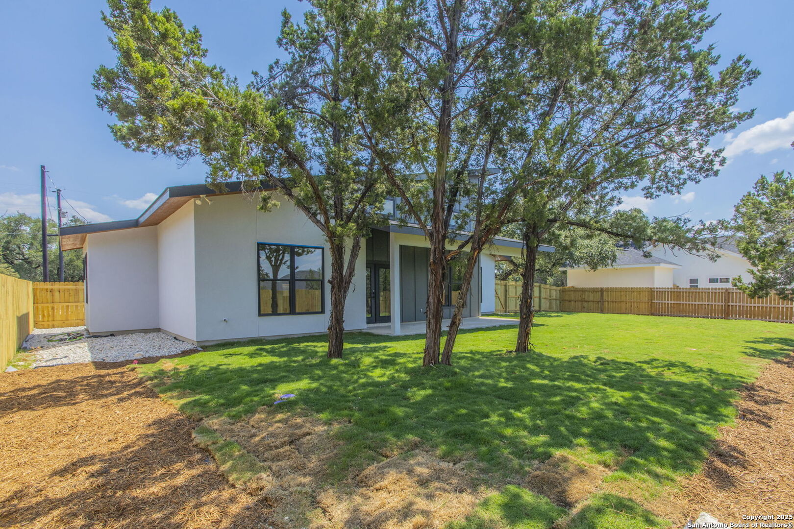 Brand-New Modern Home in Cypress Cove - Designed by Dionne Architects! Step into sleek modern living with this newly built 3-bedroom, 2-bathroom, 1,625 sq. ft. home. Designed by Dionne Architects, the home boasts 14-ft ceilings in the living, dining, and kitchen areas, filling the open-concept layout with natural light. The chef's kitchen showcases quartz countertops, custom two-tone cabinetry and a large island. The spacious living room features a stone-accent wall with an electric fireplace-perfect for gatherings or quiet nights in. The owner's suite offers a spa-like bath with dual floating vanities, a walk-in shower with frameless glass, and modern finishes. Additional highlights include luxury plank flooring throughout -no carpet-, sleek black fixtures, spacious secondary bedrooms, and a covered back patio overlooking the private yard. A large driveway and 2-car garage provide plenty of parking. Located in Cypress Cove Section 11, this home combines modern design with Hill Country charm, just minutes from Canyon Lake, shopping, dining, and Hwy 281.